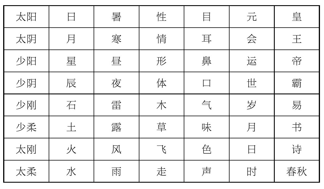 邵子之学,亦以阴阳二端解释世界,而名阴阳之源为太极,其《经世衍易图》所谓“一动一静之间”者也。《观物内篇》云:“一动一静者,天地之至妙者欤?一动一静之间者,天地人之至妙者欤?”即指太极言之也。邵子谓“天生于动,地生于静”,“动之始则阳生焉,动之极则阴生焉。静之始则柔生焉,静之极则刚生焉”。阴阳之中,复有阴阳;刚柔之中,复有刚柔,故各分为太少。太阳为日,太阴为月;少阳为星,少阴为辰,此天之体也。太柔为水,太刚为火;少柔为土,少刚为石,此地之体也。日为暑,月为寒,星为昼,辰为夜,此天之变也。水为雨,火为风,土为露,石为雷,此地之化也。暑变物之性,寒变物之情,昼变物之形,夜变物之体,此动植之感天而变者也。雨化物之走,风化物之飞,露化物之草,雷化物之木,此动植之应地之化者也。推之一切,莫不皆然。