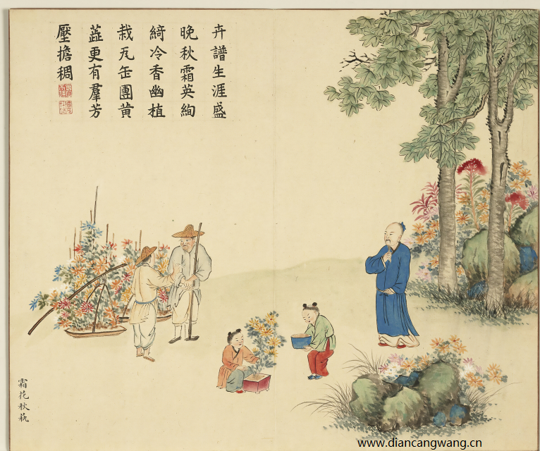 卉譜生涯盛晚秋,霜英絢綺冷香幽。植栽瓦缶團黃蕋,更有群芳壓擔稠。