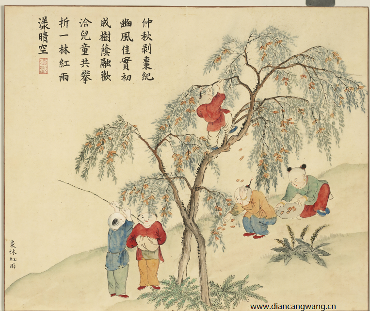 仲秋剝棗紀豳風,佳實初成樹蔭融。歡洽兒童共攀折,一林紅雨漾晴空。