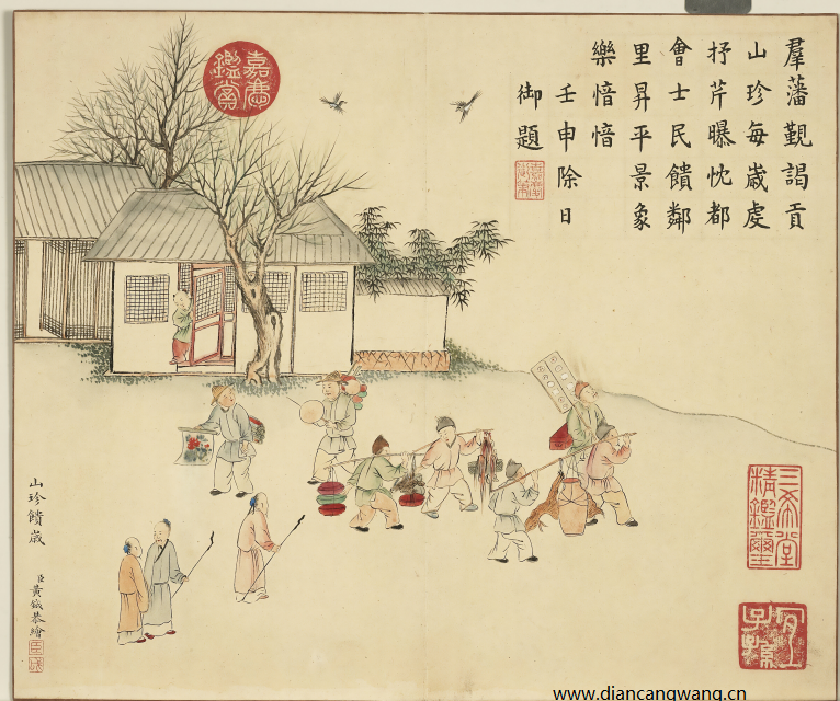 群藩覲謁貢山珍。每歲虔抒芹曝忱。都會士民饋鄰里。昇平景象樂愔愔。
