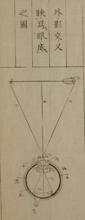 夫眼目鑑視之理。諸說紛然。無得其精義者。獨西哲勃伊私之說。得其實測。故予專從之。更制新圖。且聊述其理。以示後學。蓋鑑視之理者。來影與精神內外感應而使然者也。譬如鏡面對日光。則光輝抵激發閃爍細光芒而反照。故日月燈火之光輝。照射物象。抵激其物則反映於眼目。作一直尖而入於瞳子之小孔。遂感觸於網膜。使物景得知覺於精神也。乃是其反照之光輝尖頭。先於角膜之部。交叉顛倒。而透徹於稀薄之水樣液中。縮入於葡萄膜之小孔。次於凝固橢圓水晶液之部。更再交叉顛倒。而入軟闊之硝子液中。竟使來影映寫網膜。而達視神經。蓋起先來影之倒映者。復為顛倒。故在網膜之部。而正映真寫之。而令不失物景之本態也。其水晶液之為用也。隨物景之遠近進退運動。而令適視物之度者也。硝子液之周圍。以塗抹黑稠液。昏暗而無光輝。抵激為反照之勢。故物象益加明朗矣。此乃如暗室穿小孔引外影也。所縮入其孔中之物影。皆顛倒映寫焉。試將一片硝子版。掩其小孔。則來影彌洞明。而光彩色澤。真如繪畫。而復將一枚之硝子重懸。則顛倒之外影。遂成正影矣。能以此徵之比考眼目。則不待予言而其理自了然。