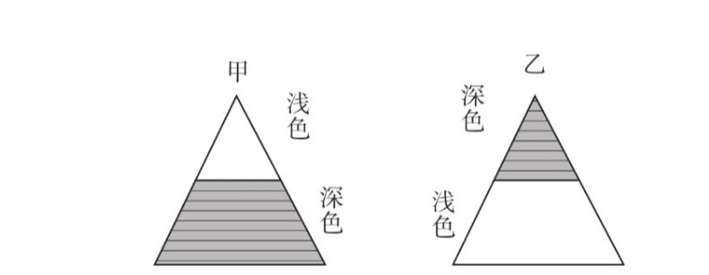 布洛常用各种颜色的形状来试验颜色的重量原理,比如有两个面积角度都相等的三角形叫做甲和乙(如下图),它们都从中腰平分,然后着两种深浅不同的颜色,使在甲形占上半的浅色在乙形占下半,在甲形下半的深色在乙形占上半。布洛使受验者比较甲乙两形,问他喜欢哪一个,并且叫他说出理由来。他试验过五十人,发现多数人都欢喜甲形而不欢喜乙形。他们大半说甲形比较稳定,乙形上半太沉重,下半太轻浮,令人生首尾倒置的感觉。